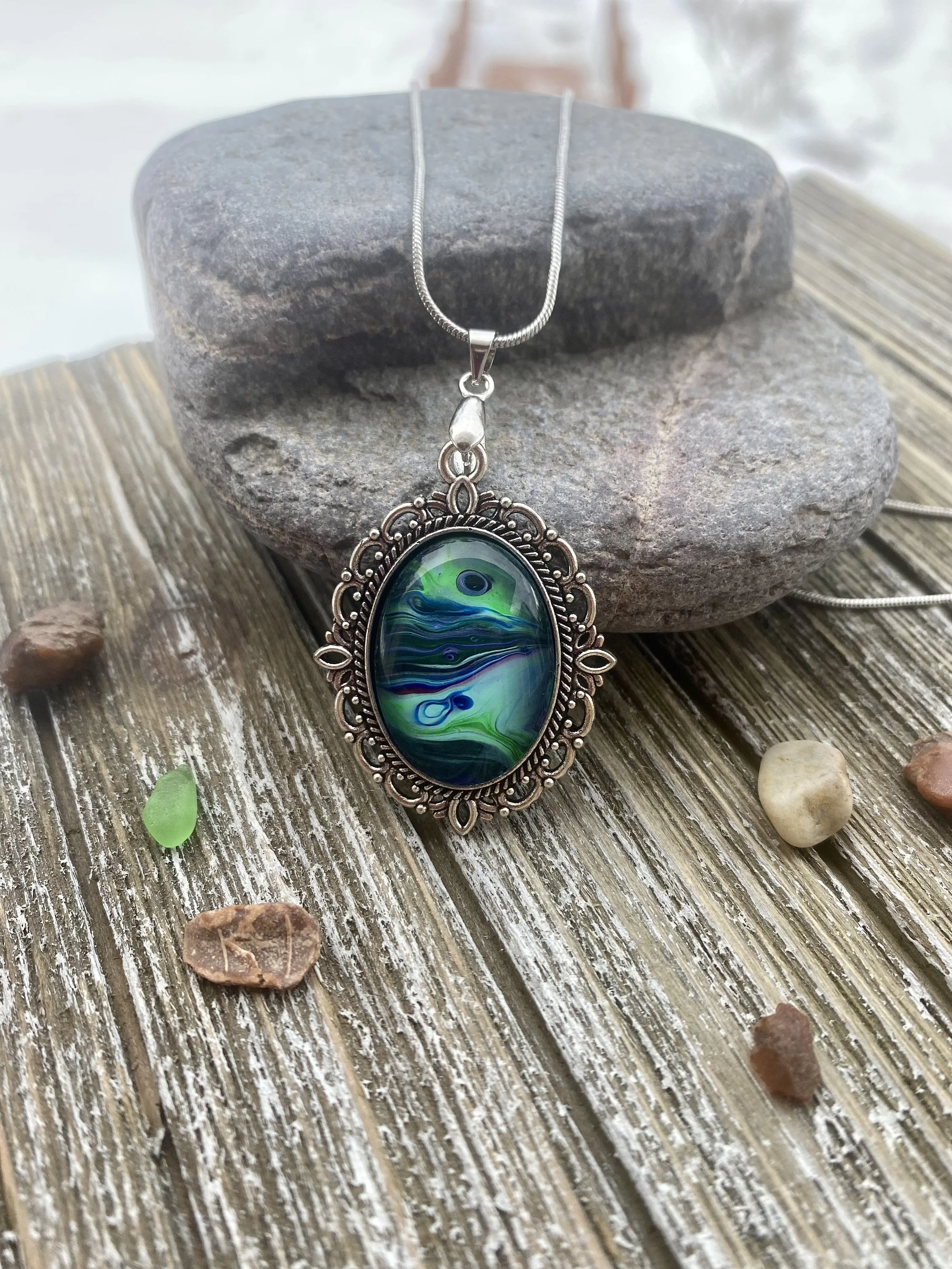 Paint Pour Jewelry - Oval Pendant Necklace - Fluid Art - Hand Painted - Acrylic Pour Jewelry