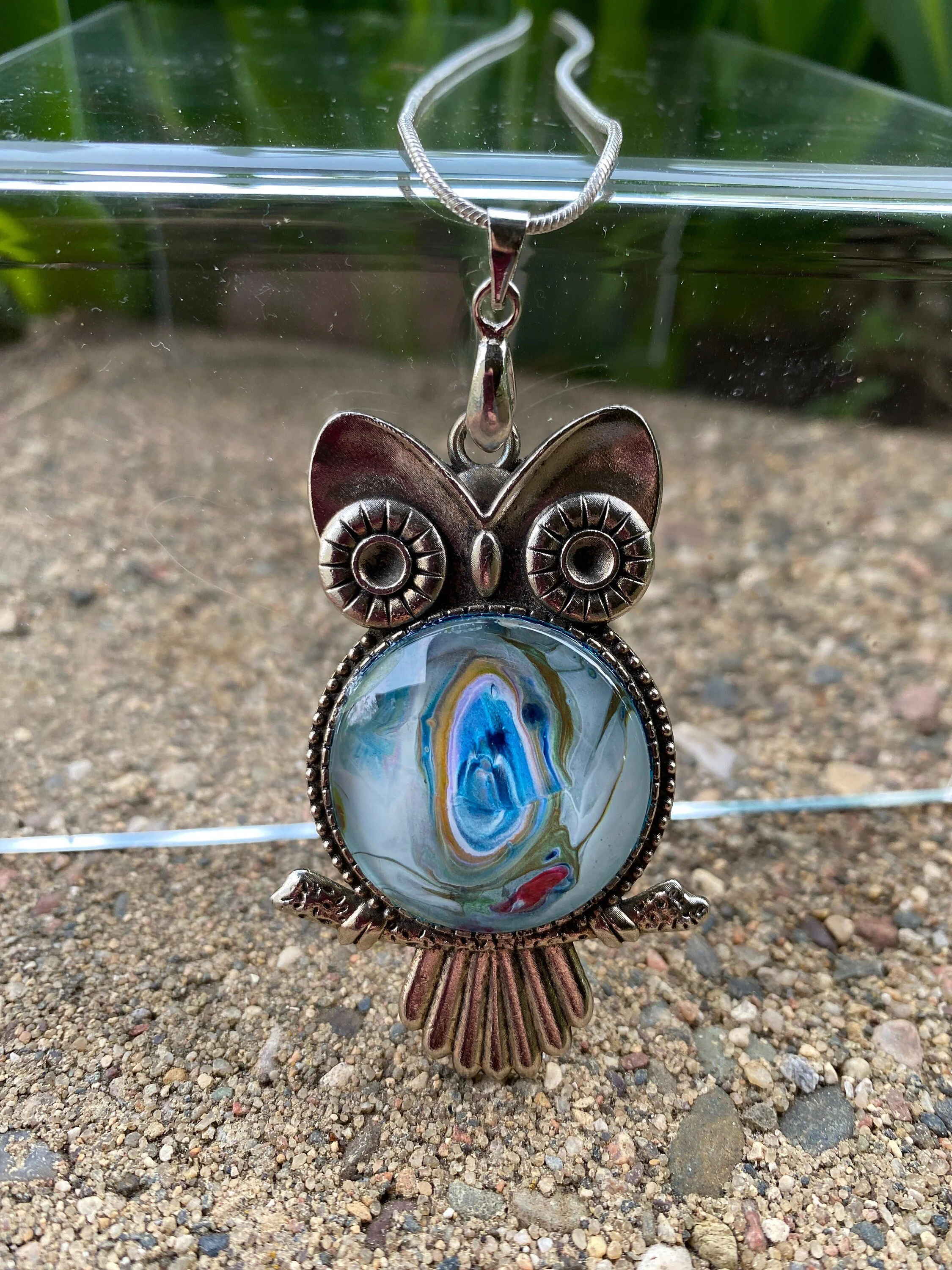 Paint Pour Jewelry - Owl Pendant Necklace - Fluid Art - Hand Painted - Acrylic Pour Jewelry